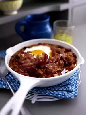 Add the beans to the meat, continue cooking for 3-4 minutes. Season to taste with Tabasco, cayenne pepper and chilli powder. Serve with fried eggs and bacon