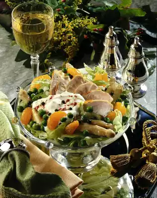 Season to taste with salt. Stir in peppercorns. Cut the meat into slices. Carefully mix salad, tangerines, peas and asparagus and place in glass bowls. Arrange the meat on top. Spread the sauce over the meat and serve.
