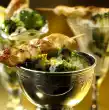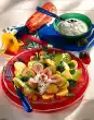 In the meantime, clean and wash the salad and cut into fine strips. Drain the mandarin oranges and collect the juice. Drain asparagus and cut into pieces. Stir crème fraîche, 2 tablespoons of mandarin juice and mayonnaise until smooth. Season to taste with salt. Stir in peppercorns. Cut the meat into slices. Carefully mix salad, tangerines, peas and asparagus and place in glass bowls. Arrange the meat on top.