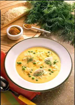 Put the rice into boiling salted water and let it swell at low heat for about 20 minutes. Wash the chicken filet and let it simmer in the boiling chicken soup for about 15 minutes. Remove the meat. Pick up broth. Heat fat in a pot, sweat flour in it and deglaze with chicken stock and milk while stirring, let it boil well. Season to taste with curry, salt and pepper. Let peas steep in the soup for 5 minutes. Cut meat into strips. Pour rice on a sieve and drain. Add rice and meat strips to the soup. Garnish with fresh dill