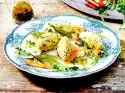 In the meantime, peel and chop the garlic for the salsa verde. Drain capers and anchovies. Wash parsley and shake dry. Pluck off leaves and chop finely, except for something to garnish. Puree sour cream, garlic, capers, anchovy and parsley in a tall mixing bowl. Season to taste with sugar, pepper and lemon juice