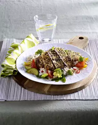 In the meantime, wash the meat, dab dry and cut in half horizontally. Mix sesame and breadcrumbs in a shallow bowl. Whisk the egg. Pour flour into a flat bowl. Season meat with salt and pepper. Turn first in flour, then in egg and sesame-breadcrumbs mixture. Heat 4 tablespoons of oil in a large frying pan. Fry the meat in it in 2 portions of each side 3-4 at medium heat until crispy brown