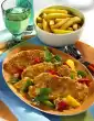 Cut the remaining lime into slices. Wash 1 tomato, grate dry and cut into slices. Dice 3 apricots. Serve cutlets with the salsa, sour cream and tortilla chips. Cover schnitzel with tomato slices and sprinkle with diced apricots. Garnish with lime slices and marjoram