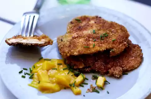Fry the escalopes in portions on each side for 2-3 minutes until golden brown. Drain on kitchen paper. Crisp up with the mango dip.
