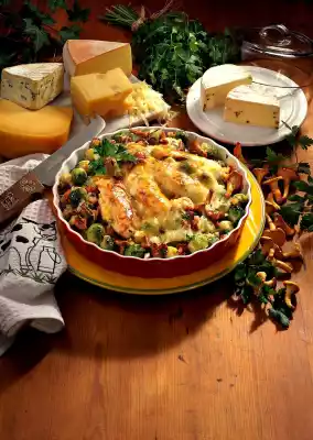 Fry bacon and onions in it. Add chanterelles and fry briefly. Pour Brussel sprouts on a sieve, let them drain, add them to the pan and toss them briefly. Put vegetables and chicken filet in an ovenproof dish. Coarsely grate the cheese, mix with breadcrumbs and sprinkle over it. Bake in a preheated oven (electric cooker: 225 ° C/ gas: level 4) until the cheese has melted. Garnish with parsley