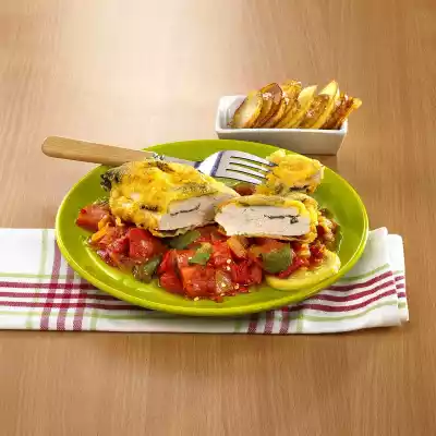 Wash parsley, dab dry, pluck leaves from the stalks. Wash chicken fillets and pat dry. Cut a deep pocket into each one. Fill with 2/3 of the parsley leaves. Mix flour with 1/4 teaspoon salt, allspice, cinnamon and chilli powder. Whisk the eggs.