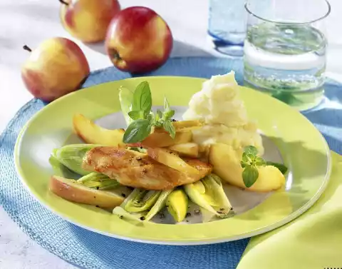 In the meantime, bring milk and 150 ml water to the boil, remove from the heat and stir in the puree flakes. Let it swell for one minute, then stir again. Season to taste with salt and nutmeg. Arrange leek and apple vegetables, chicken filet and puree on two plates.