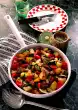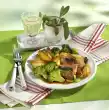 In the meantime, heat the remaining oil in a saucepan and lightly fry the leek and apples. Deglaze with apple juice and stock, bring to the boil and simmer at low heat for 6-8 minutes. Season to taste with salt and pepper.