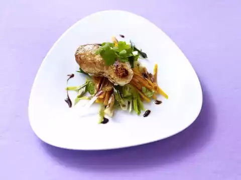 Add 1 tablespoon of oil, 1 tablespoon of sugar and vinegar to the vegetables, bring to the boil, season to taste with salt, pepper and sugar, stir in the coriander. Arrange vegetables and meat on plates, garnish with coriander leaves