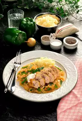 Heat up the soup. Add sauerkraut and strips of paprika to the soup. Steam covered for about 10 minutes. Mix the paprika pulp with some stock and add to the vegetables. Season to taste with salt, pepper and caraway. Cut the chicken fillets into slices. Arrange on plates with the vegetables. Grind black pepper on top. Stir sour cream until smooth and add 1 tablespoon to each portion.
