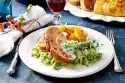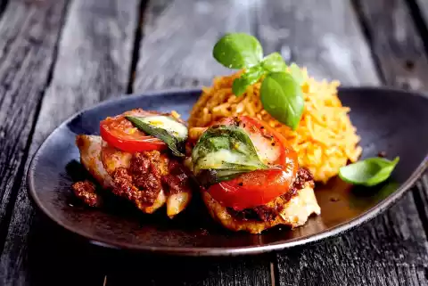 Line the bottom and base of the Varoma with baking paper, leaving the slots for the steam free. Wash the meat, dab dry and cut diagonally into small cutlets. Distribute in the Varoma and base. Season with salt, pepper and Italian herbs. Spread with pesto. Wash the tomatoes. Wash basil and shake dry, dab off leaves. Cut tomatoes and mozzarella into slices and spread on the meat with basil.