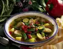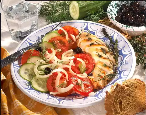 Mix cucumber, tomatoes, onion and olives. For the marinade mix 1-2 tablespoons of water, some herb vinegar and dill in the frying fat. Pour over the salad. Arrange salad and chicken filet on a plate. Serve with a slice of farmhouse bread