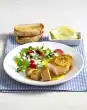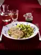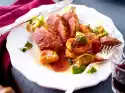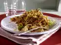Meanwhile, prepare the pasta in boiling salted water according to the instructions on the packet. Heat the oil. Fry mushrooms and onions for about 3 minutes. Fry the tomatoes for the last minute. Deglaze with cream. Add stock, bring to the boil and thicken with sauce thickener.