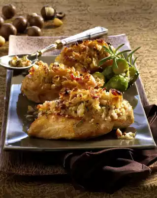 Wash the meat and dab dry. Fry in hot oil in an ovenproof pan for about 5 minutes. Season with salt and pepper. Spread the nut mixture over the meat, press it on