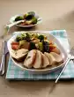 Wash the meat, dab dry and season with salt and pepper. Heat 1 tablespoon of oil in a frying pan. Fry the meat for approx. 8 minutes, turning it over. Season ratatouille with sugar, salt and pepper. Arrange ratatouille and chicken, garnish with thyme