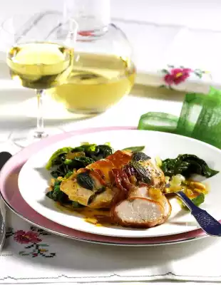 Arrange spinach, chicken fillets and sauce on plates. Garnish with sage.