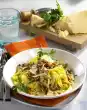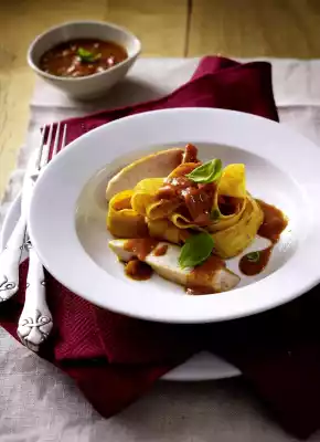 Bring to the boil and simmer for about 5 minutes, stirring occasionally. Season to taste with salt and pepper. Drain the pasta in a sieve and put it back into the pot. Add sauce and fold in. Cut meat into slices.