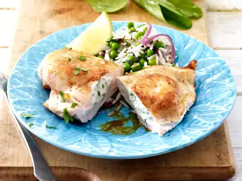 Prepare rice in boiling salted water according to package instructions. Wash the meat, dab dry. Cut a pocket into it and season with salt and pepper. Add 1-2 tablespoons of cream cheese filling each. Pin with wooden skewers.