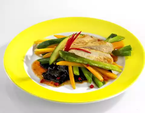 Add seaweed and fry together for about 8 minutes. Heat 1 teaspoon sesame oil in another pan. Fry the prepared vegetables for about 8 minutes. Season with salt and Asian sauce. Cut the chicken filet into slices. Serve the vegetables and chicken filet garnished with a carved chilli pepper