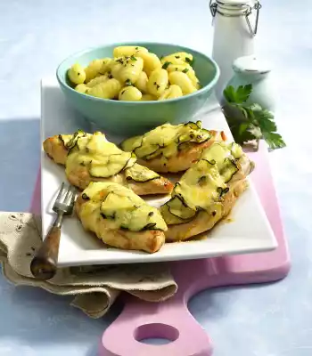 Fry the zucchini briefly in the frying oil. Season with salt and pepper. Spread the zucchini over the chicken fillets. Grate cheese finely and sprinkle over the zucchini. Bake in the preheated oven (electric cooker: 200 °C/ convection oven: 175 °C/ gas: level 3) for about 5 minutes until the cheese has melted. Let the gnocchi stand in boiling salted water for 1 minute. Drain on a sieve. Melt butter in a pan. Toss the gnocchi in it. Wash parsley, shake dry, chop coarsely and sprinkle over the gnocchi.