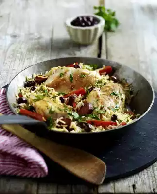 Drain the rice. Season the fillets with salt and pepper, remove and keep warm. Heat 1 tablespoon of oil in the frying fat. Fry onion, garlic, sausage and pepper strips in it for 2-3 minutes. Add rice and olives and stir-fry for 2-3 minutes.
