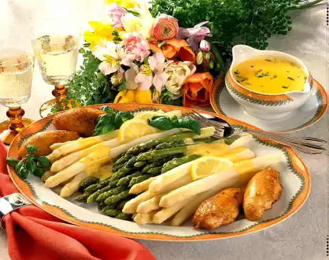 Add green asparagus after 10 minutes. Meanwhile wash the meat, dab dry and season with salt and pepper. Fry in hot oil for 10-15 minutes until golden brown. Bring the hollandaise sauce to the boil with 1/4 litre of asparagus stock.