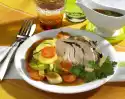 Meanwhile wash and halve the tomatoes. Distribute on the baking tray about 10 minutes before the end of the cooking time. Arrange meat and vegetables on plates