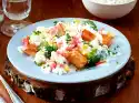 Peel the skin off the chicken. Remove meat from the bone and cut into pieces. Prepare rice in boiling salted water according to package instructions. Then add 25 g butter in flakes
