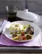 Place the egg yolks in a small bowl and whisk with a fork. Add about 4 tablespoons of hot sauce drop by drop. Then pour into the sauce in a light jet, stirring constantly. Add meat, asparagus, mushrooms and peas. Heat again (do not boil!), season with salt and pepper