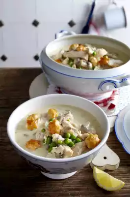 Dust with flour. Add stock and milk while stirring. Bring to the boil and simmer for about 15 minutes. Add mushrooms and peas and cook briefly in the soup. Season to taste with lemon, salt and pepper.