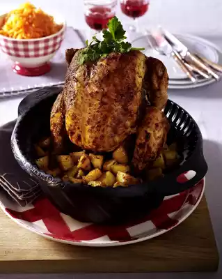 Wash the chicken and pat dry well. Season from the inside with 1 level teaspoon salt and a little pepper. Place the chicken in the bowl. Mix 1 1⁄2 tsp. sweet paprika, 1 slightly heaped tsp. salt, some pepper and 2 tbsp. olive oil.