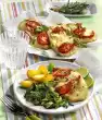 Wash the chicken fillets, dab dry and cut into thin slices or strips. Wash tomatoes, dab dry and cut into slices. Drain the corn on a sieve. Peel and halve onions and cut into strips except for one half.
