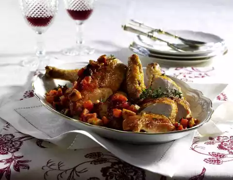 Wash the chicken, dab dry and cut into 4 pieces. Heat the oil in a casserole. Brown chicken parts all around, season with salt and pepper. Deglaze with wine. Steam meat for another 10 minutes at medium heat.
