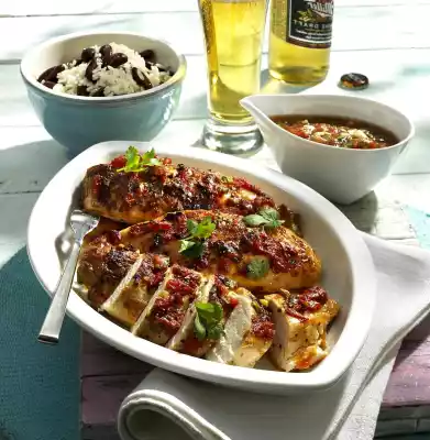 Put 3 tablespoons of olive oil in a flat roasting pan. Season the chicken fillets with salt and pepper and place them in the roaster. Spread with some tomato-rum sauce and bake in the preheated oven (electric cooker: 225 °C/ convection oven: 200 °C/ gas: level 4) for 25-30 minutes. In between spread the sauce once or twice more. Serve the chicken with the remaining tomato rum sauce. Serve with bean rice