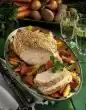Wash the chicken, put it in a big pot. Clean and wash the soup greens. Peel carrots and celery. Cut everything into large pieces. Wash the lovage. Put the soup greens, bay leaf, juniper, cloves, peppercorns and lovage in the pot.