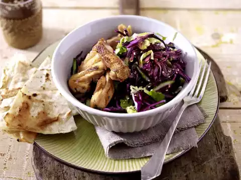 Fold the vinaigrette and sesame seeds into the salad and leave to stand for about 30 minutes. Boneless chicken legs, cut meat into strips. Heat 2 tablespoons of oil in a frying pan. Fry the meat for 4-5 minutes in portions, turning, season with salt and pepper and remove. Season salad to taste with salt, pepper, sugar and vinegar, arrange with meat in bowls. Add roasted flatbread