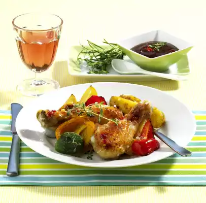Mix thyme, rosemary and oil and mix with the potatoes. After about 10 minutes, spread the potato wedges between the legs and continue cooking. Halve, clean and wash the peppers. After about 30 minutes add to the legs.