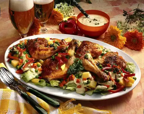 Add the vegetables and pour half the sauce over them. Arrange chicken legs on top. Garnish with parsley and serve the rest of the sauce separately.