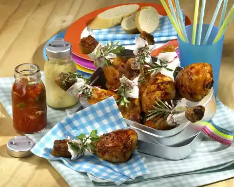 Fill dips into sealable jars. Let the finished chicken legs cool down a little. Then wrap a strip of parchment paper around each leg and tie up with kitchen string. Tie a small sprig of herbs as a garnish.