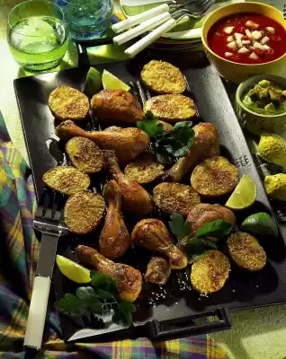 Garnish chicken legs with lime wedges and parsley. Serve with the dips.