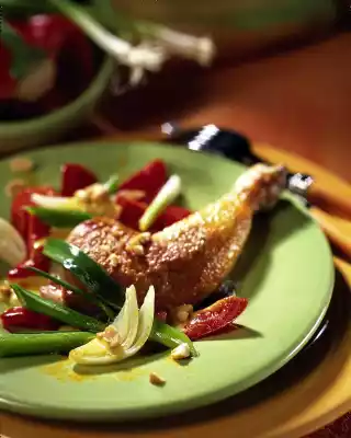Wash chicken legs and pat dry. Rub with salt, pepper and paprika. Coat the fat pan of the oven with oil, place legs on top and roast in the preheated oven (electric cooker: 200 °C/ gas: level 3) for approx. 25 minutes.