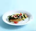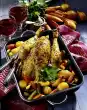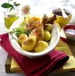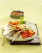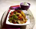 Wash the lettuce leaves, pat dry and arrange on 4 plates. Arrange raw vegetables on top. Add chicken legs. Garnish with tomato and remaining basil. Add the dip