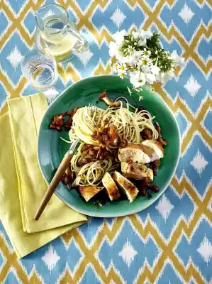 Arrange meat, noodles and chanterelles with marsala sauce on plates.