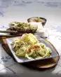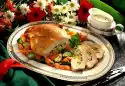 Season with salt and pepper. Cut the chilli pepper lengthwise, wash and cut into rings. Arrange chicken fillets with sauce on plates. Sprinkle with raisins, almonds and chilli rings.