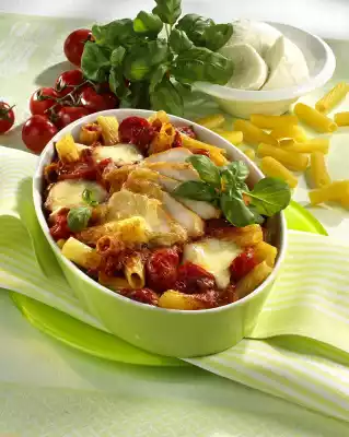 Cover and simmer for another 5 minutes, season with salt and pepper. Mix the pasta with half of the tomato sauce and place in a greased casserole dish. Cut the chicken fillet into slices, place them on the noodles and spread the remaining tomato sauce on top.
