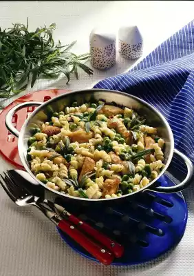 Take it out. Pour cream into the frying fat. Stir in basil and peas. Bring everything to the boil briefly. Add meat again. Heat over low heat for about 5 minutes. Drain the pasta and fold in.