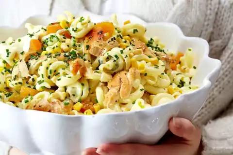 Tear meat finely. Mix well with noodles, corn and salad dressing. Let the salad steep for about 2 hours. Season to taste with salt and pepper.