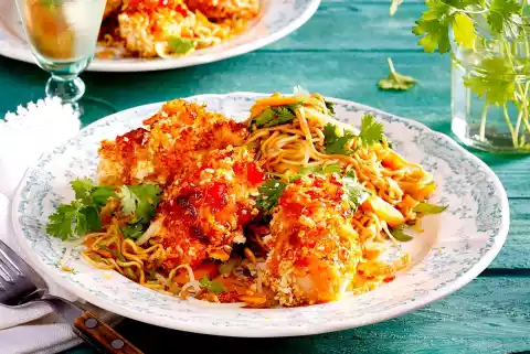 Mix asia sauce and honey. Sprinkle the cutlets with the sauce and bake for about 10 minutes. In the meantime prepare and drain the noodles according to the instructions on the packet. Heat the oil in a wok or large frying pan. Sauté the carrots and leek for about 5 minutes. Add the sprouts and steam briefly.