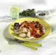 Boil up the sauce and season with salt, cayenne pepper and curry. Simmer for 2-3 minutes and let cool off. Clean, wash and drain the salad. Cut all but 4 nice, small leaves into strips.