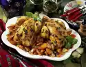 Wash the chicken and pat dry. Divide into 8 pieces. Season with salt and pepper. Place on the fat pan. Roast in the preheated oven (electric cooker: 200 °C/circulating air: 175 °C/gas: level 3) for approx. 50 minutes